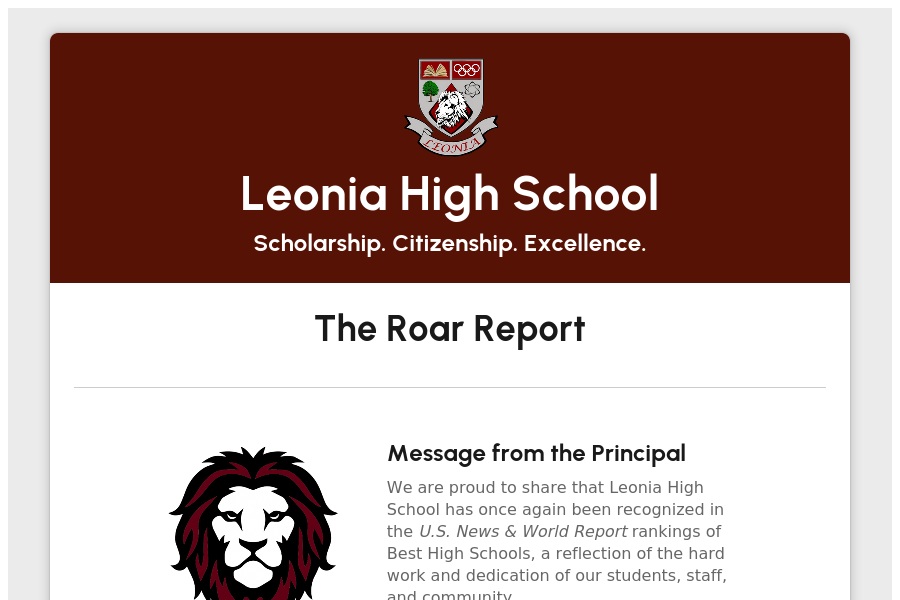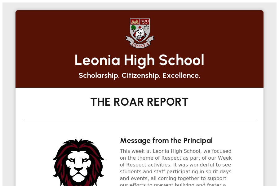 Leonia High School Scholarship. Citizenship. Excellence. THE ROAR REPORT Message from the Principal This week at Leonia High. . .